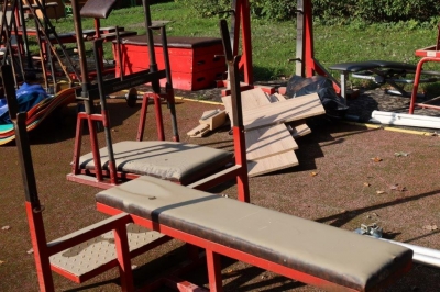 Učitelé i studenti se zapojili do odklízecích a čistících prací. Zvládly se vyrobit a ušít nové polstry na opěrky i lavice, ale samotné posilovací stroje stály na chodbě a byly nepoužitelné.