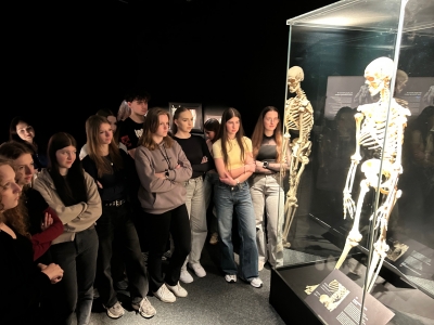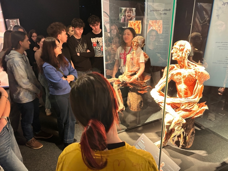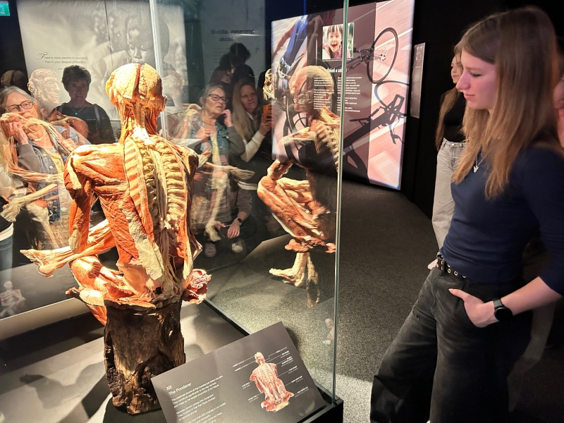 Naší první zastávkou byla výstava Body Worlds Těla v pohybu, kde jsme měli jedinečnou příležitost nahlédnout „pod pokličku“ lidského těla. Ujala se nás sympatická medička, která nás provedla jednotlivými exponáty – od kostí přes svaly až po celá lidská těla. Vysvětlovala nám, jak tělo funguje, a také co se stane, když se něco pokazí.