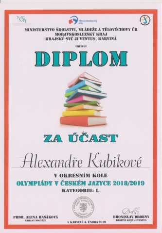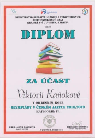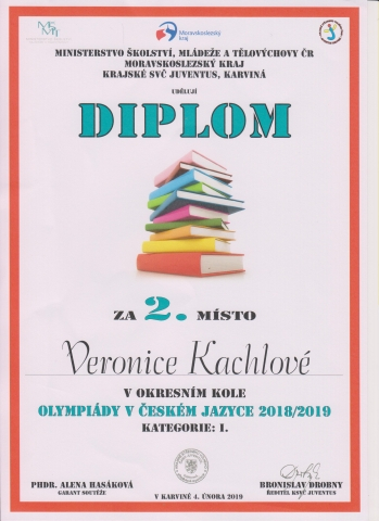 Ve dnech 4. – 5. února 2019 proběhlo v Karviné okresní kolo olympiády v jazyce českém. V první kategorii (tercie – kvarta) se v konkurenci 87 účastníků na vynikajícím 2. místě umístila Veronika Kachlová z kvarty a postupuje do krajského kola. Hezké 14. místo vybojovala Alexandra Kubiková z tercie. Ve druhé kategorii (1. – 4. ročník SŠ) se na 4. místě umístila Viktorie Kaňoková z kvinty a na 2. místě (opět postupovém) Magdaléna Stachová ze sexty. Všem našim studentkám děkujeme za vzornou reprezentaci školy, oběma postupujícím gratulujeme a držíme palce v krajském kole, které proběhne 4. dubna.