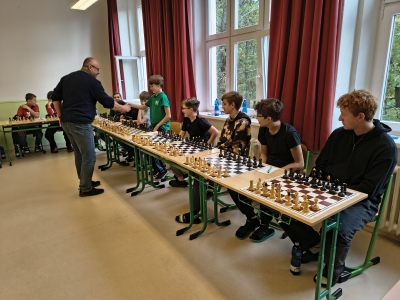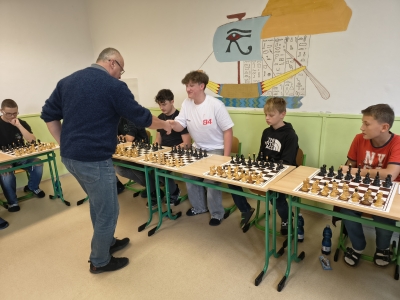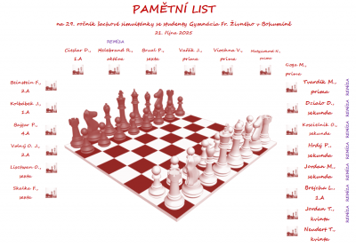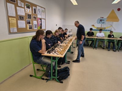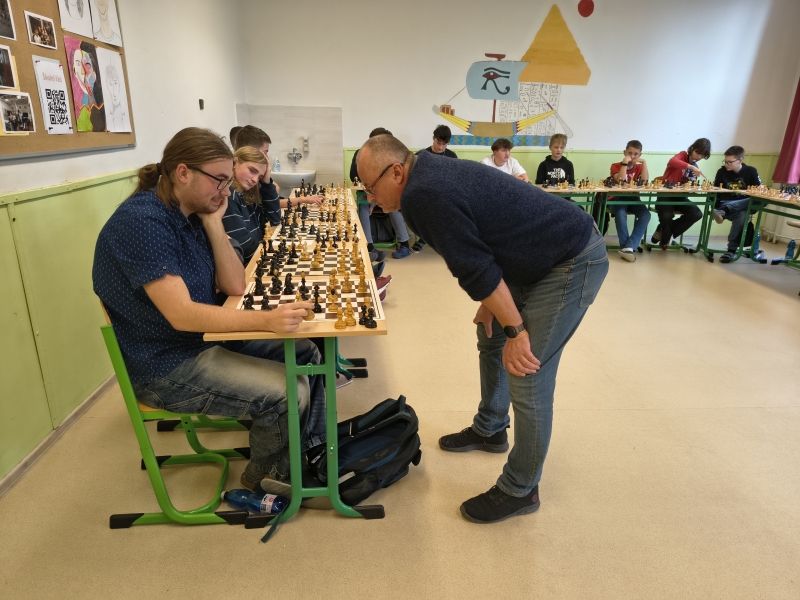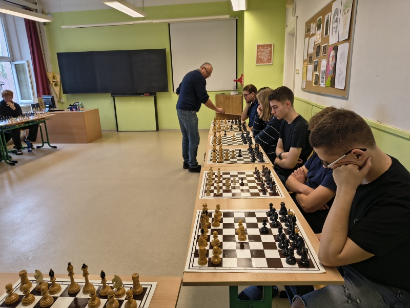 Letos se nikomu nepodařilo pana místostarostu porazit! Za úspěch našich studentů se dá považovat osm uhraných remíz: Jordana Tobiase, Brejchy Lukáše, Jordana Mathiase, Hrdého Petra, Koscielnika Ondřeje, Dziala Davida, Tvardíka Matěje a Helebranda Richarda. Dále ing. Vícha pochválil partie s Neudertem Tomášem, Skalkou Filipem, Volným Janem Ondřejem a Cieslarem Dominikem, který "vydržel" nejdéle! Hrát se začalo ve 12:20 a poslední partie byla ukončena 14:30. K bílým figurám letos usedlo devět žáků nižšího gymnázia (včetně jedné dívky) a 12 studentů vyššího gymnázia.