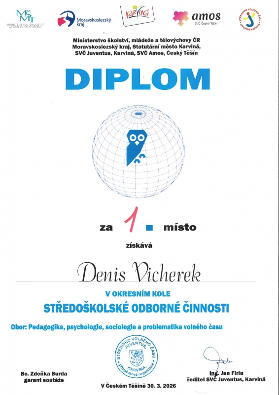 Naši školu reprezentoval Denis Vicherek ze třídy 3. A v oboru číslo 14. Pedagogika, psychologie, sociologie a problematika volného času prací „Mentalismus a psychologické metody v magii, hypnóze a kriminalistice“. Jeho projekt zaujal nejen tématem, ale také propracovaným zpracováním a přesvědčivým vystoupením.