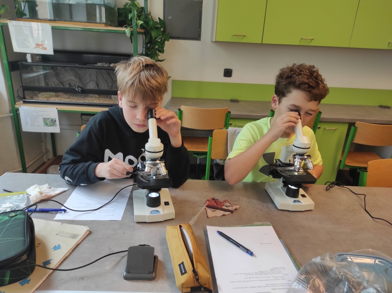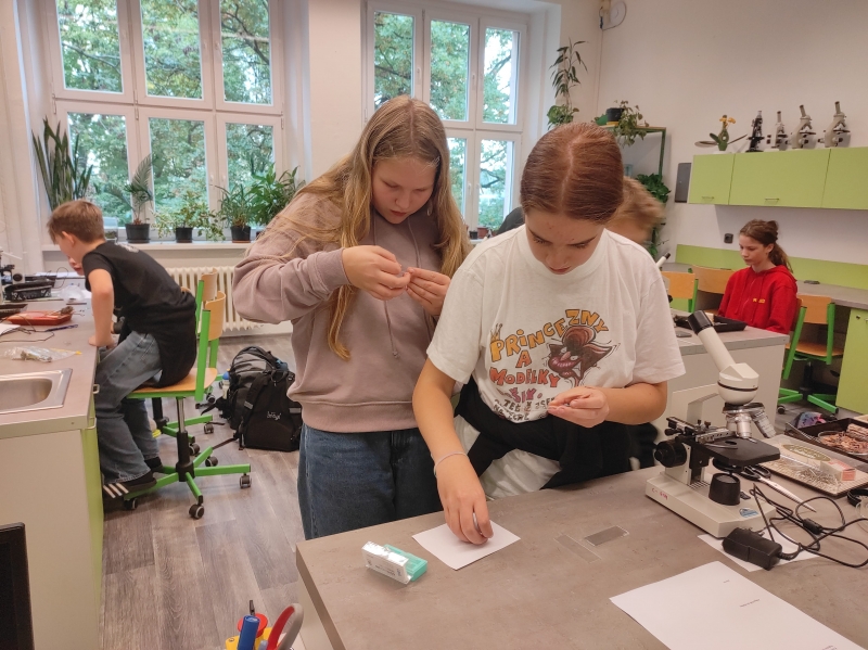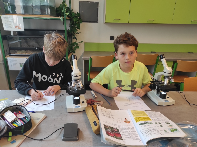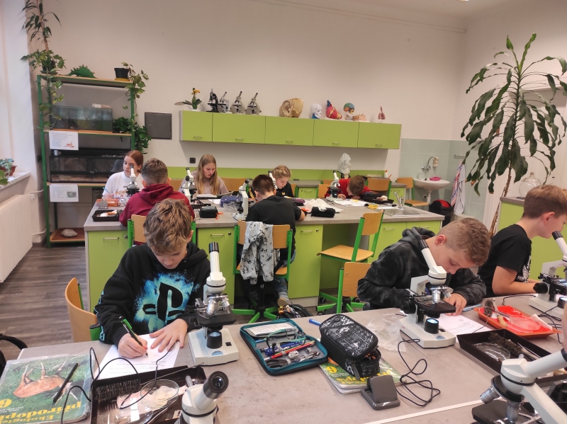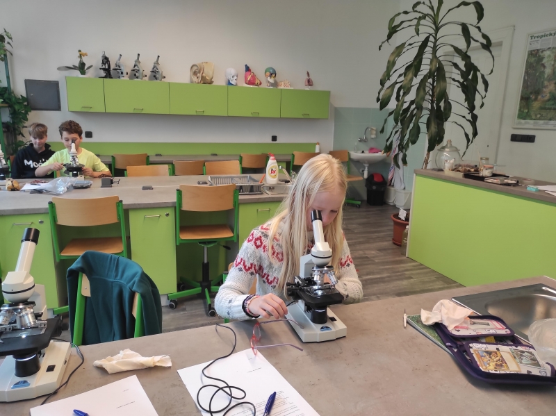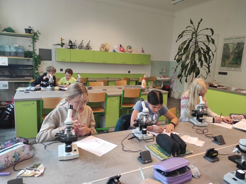 V minulých hodinách biologie se žáci primy podívali do laboratoře biologie, kde si prakticky ověřili znalosti z oblasti mikroskopování. Pozorovali jednobuněčnou řasu zrněnku.